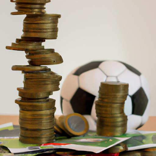 Một đống tiền mặt và đồng xu trên bàn với một quả bóng đá ở phía sau.